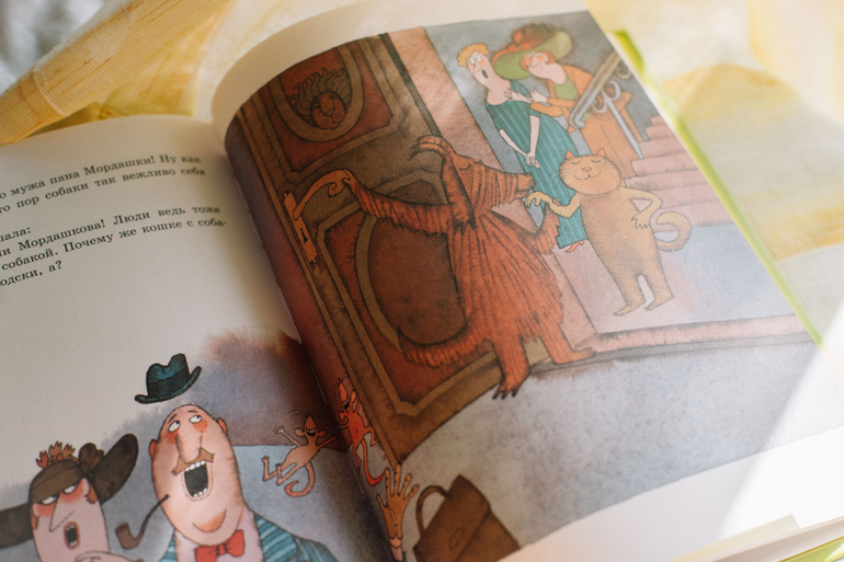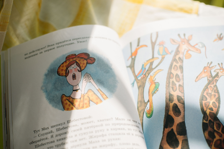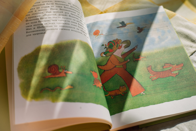 Не истории, а стиль, немного отрывистый, чуть схематичный, звучащий голосом переводчика (ага, в мультфильме вообще слов нет!)), необычные повороты сюжета, всплески чуткого абсурда, который даже близко не подходит к границе неприятия, но захватывает как занавеска на ветру или качели, имена, конечно, чудесные пани и их женские фамилии. И интерес. Читать интересно, очень! Мы махнули Маха за считанные дни, но я успела полюбить учительницу, оценить школу, увлечься приключениями, котами, черепахами, босоножками и псом Йонатаном. Лёва впечатлился Вредеком и Дубинеком, волшебной трубкой и всеми перипетиями, которые сопровождали тем не менее обычные будни школьников.