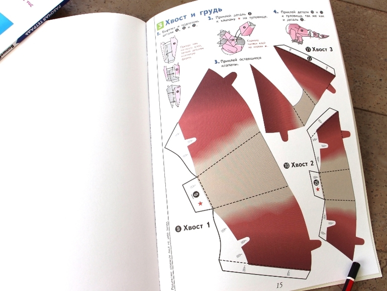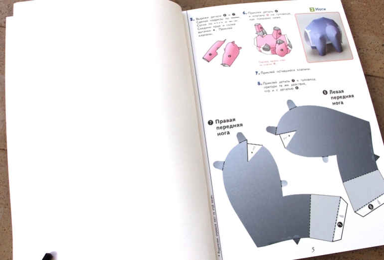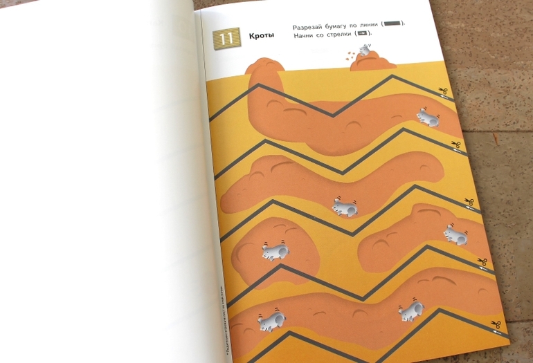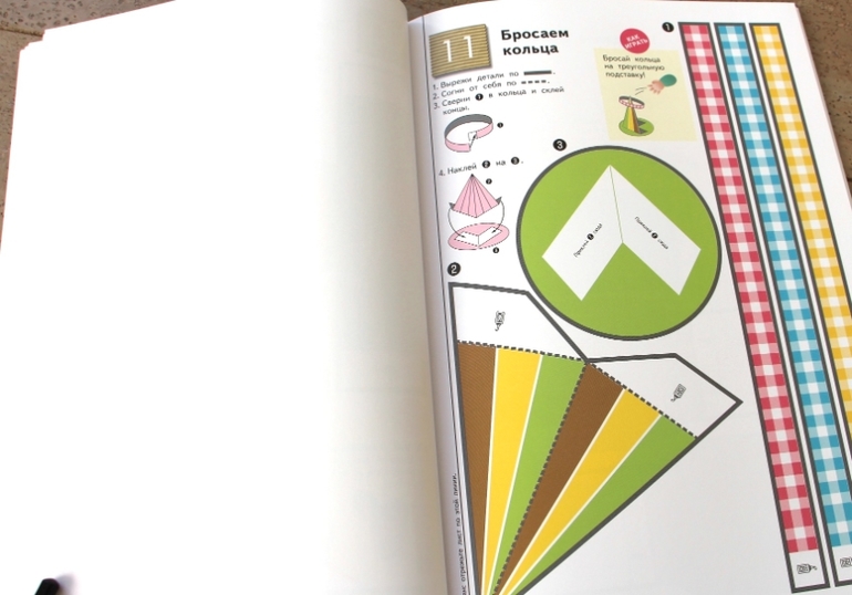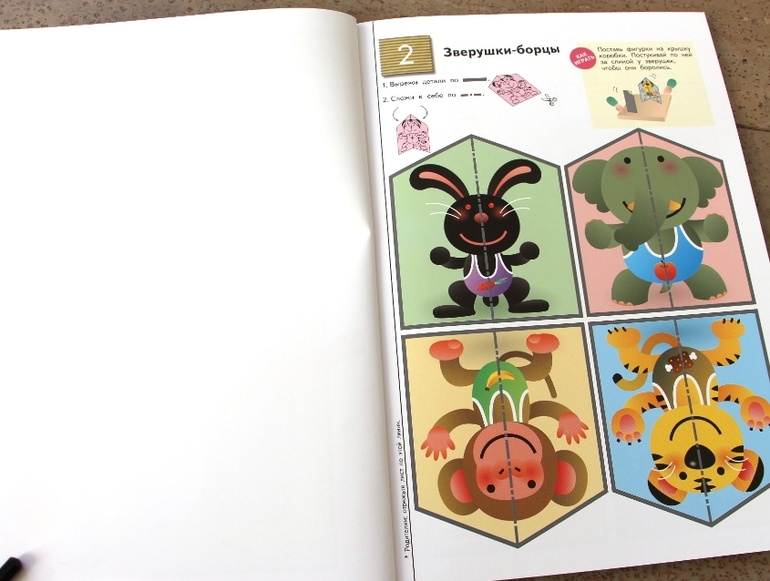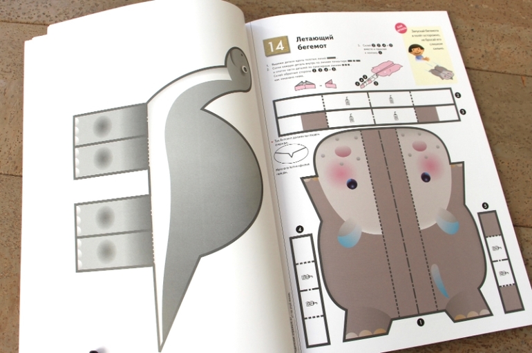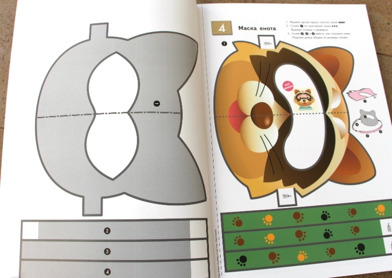 Тут важен опыт ребенка в вырезании. Мой старший мало упражнялся с ножницами, поэтому я ему уже из этой тетради задания предложила, но с середины. Справился хотя и с подсказкой, поэтому теперь перелистнём еще несколько страничек, они потом младшему достанутся. Поделки очень забавные, все с разными способами склейки и со сложными вырезаниями.