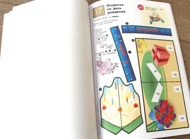 Это наша награда! Тут сложные поделки. Пишут «от 7 лет», но мой сейчас бы не справился, нужен навык изготовления поделок. Мы договорились с сыном, что он получит эту тетрадь, когда пройдет предыдущие, т.е. хорошо натренируется.
