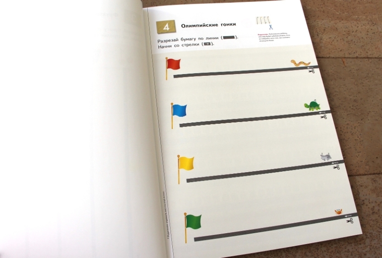 Стричь раскраски - это учит ножницами пользоваться, а вот резать по линии уже сложнее. В этом плане Кумон очень понятен ребенку - резать надо по широкой серой линии, это проще понять, чем контур искать. Листы не слишком плотные, ребенку легко вырезать. В конце вместо привычного сертификата, размещена доска для рисования маркером.