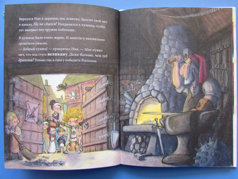 Ник очень хочет сразиться с драконом и поэтому выполняет все условия Роголома: выковать великанский меч, затем огромный щит, а после гигантские доспехи)