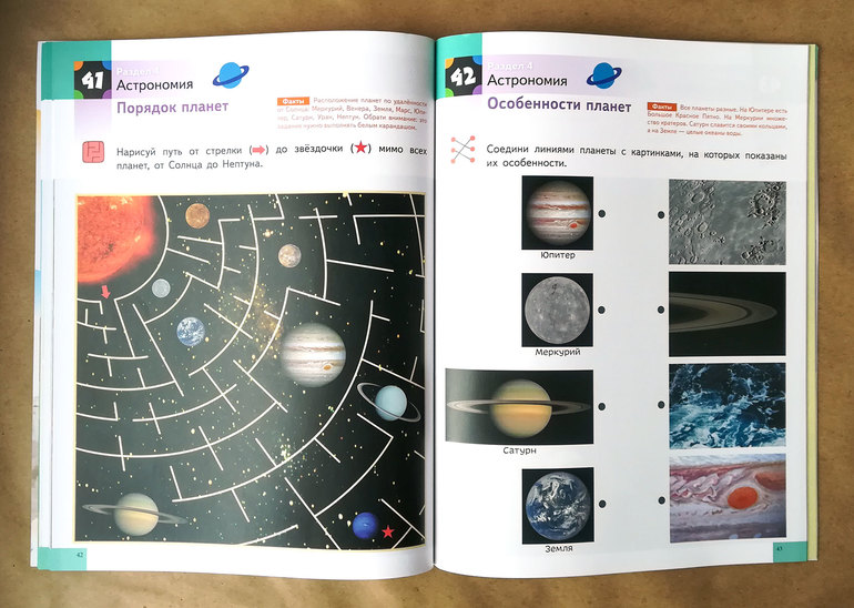 В «Науке» несколько разделов: биология, география, физика, астрономия. Задания есть совсем легкие, есть посложнее (хотя для кого как). Где-то нужно приклеить наклейки, где-то дорисовать, соединить линией или пройти лабиринт.