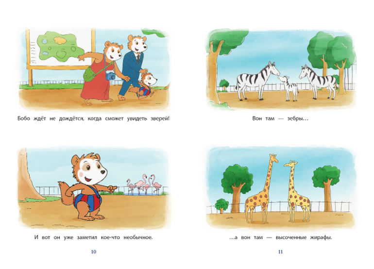 Забавные пингвинчики! Крокодил с огромной пастью! А вот и попугай! Папа подсаживает малыша на плечи: так будет лучше видно. А видеть Бобо хочет всё-всё-всё!