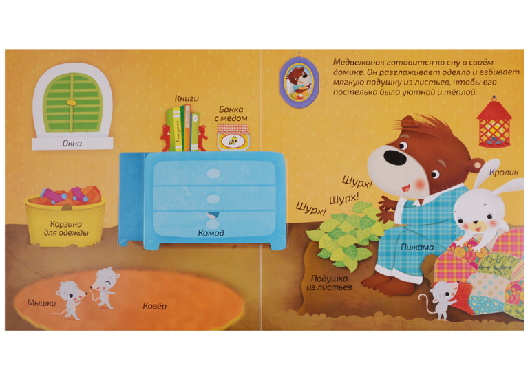 Красивые яркие иллюстрации, подписи и небольшие тексты расскажут малышу о том, как правильно готовиться ко сну и помогут пополнить словарный запас!