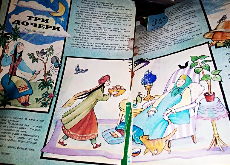 Листочки сшиты нитью, сохранилось мало страниц. Полностью есть одна сказка "Три сестры", рисунки Т. Фадеевой:
