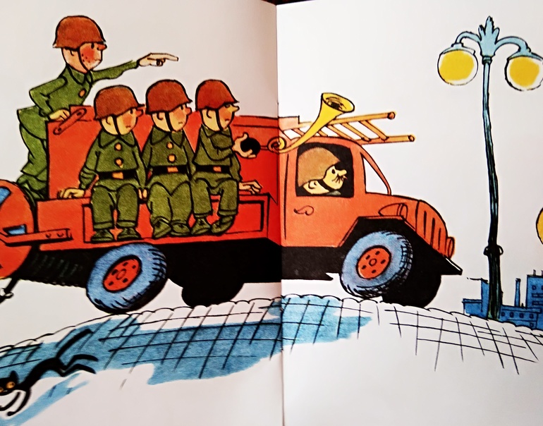 Слышны бензоинструменты, машины здесь в районном городке, как везде - большие и маленькие, но не сплошным потоком, как в большом городе. Таким образом, про транспорт мы не забываем) Любимый разворот из книжечки Погорельского "Необычный пожар", изд. Речь, 2016 год: