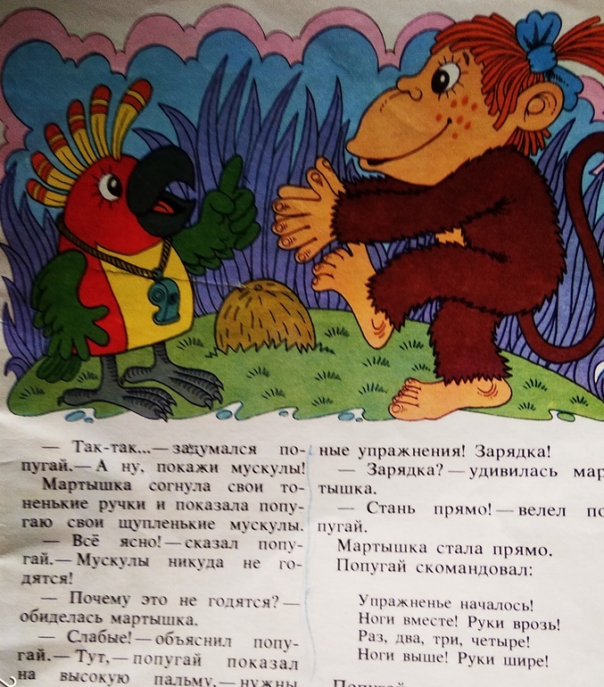 По утрам мы иногда притворялись змеями, бабочками, зайчиками и делали "зарядку для хвоста", крыльев и других частей тела, у кого какие есть) Рисунки С.Богачева и М.Байковой, авт.Г.Остер, 1994г: