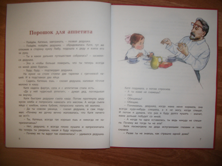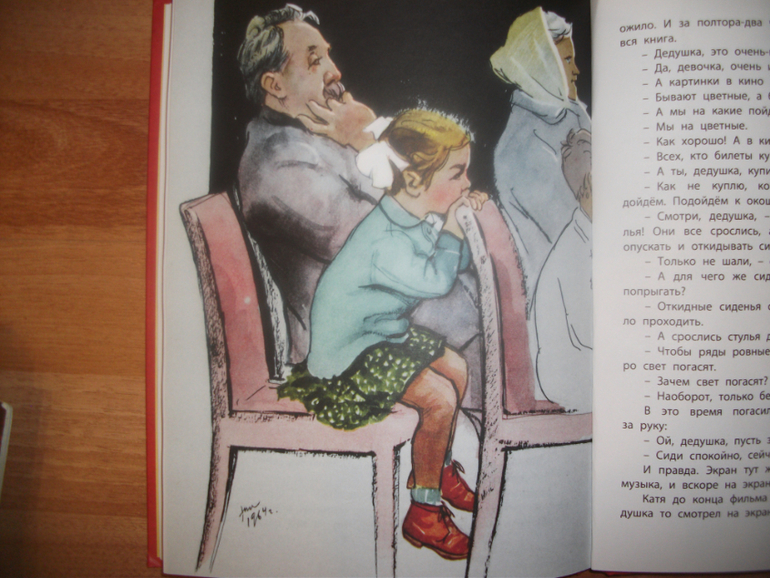 Книга просто находка для возраста 4-6 лет. Рассказ о взаимоотношениях Деда и внучки , будущей первоклассницы. Деду вышел на пенсию, теперь сидит с внучкой дома. Кате все интересно, что такое пенсия,как она приходит, как дед трубил на работе,