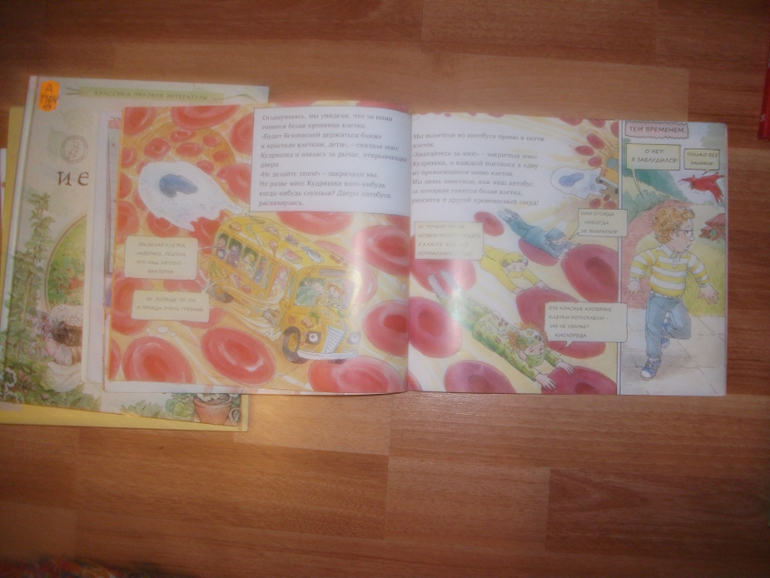 Книга-комикс, с энциклопедическими вставками. У детей весело проходят уроки, их учитель , водитель автобуса, который может доставить класс куда угодно, в зависимости от того, что на ней надето))