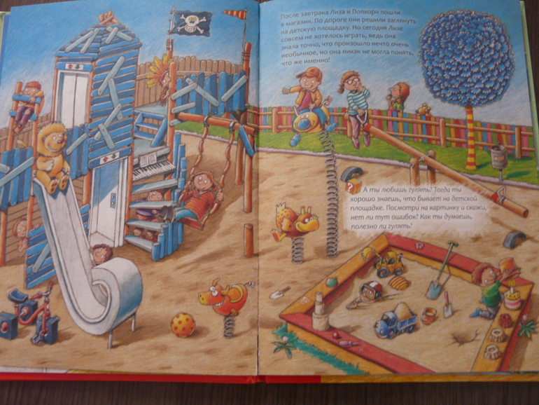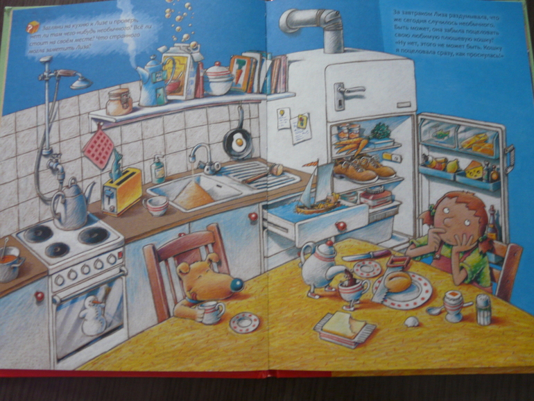 каждый разворот показывает нам эпизод из дня девочки:завтрак,прогулка,поход в магазин и т.д.И везде мы должны найти ,что же тут не так....
