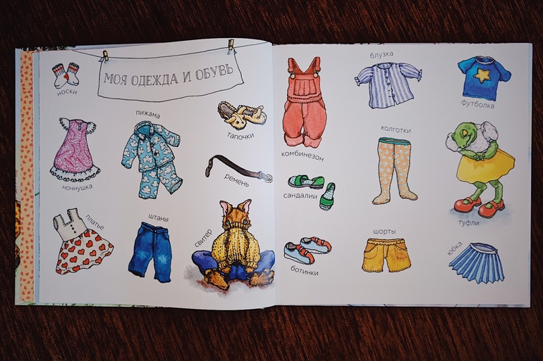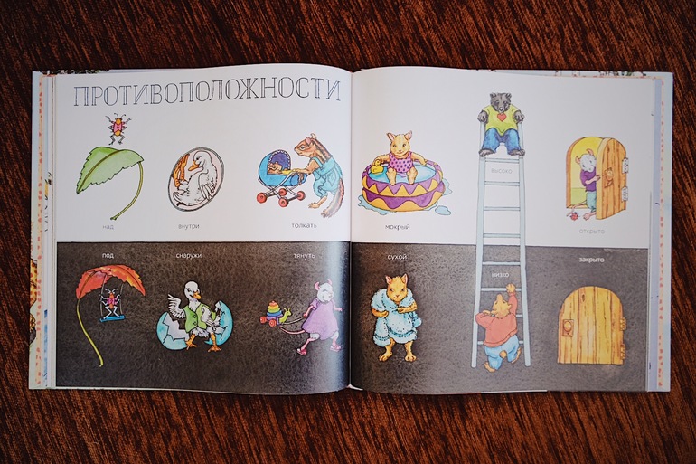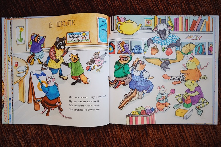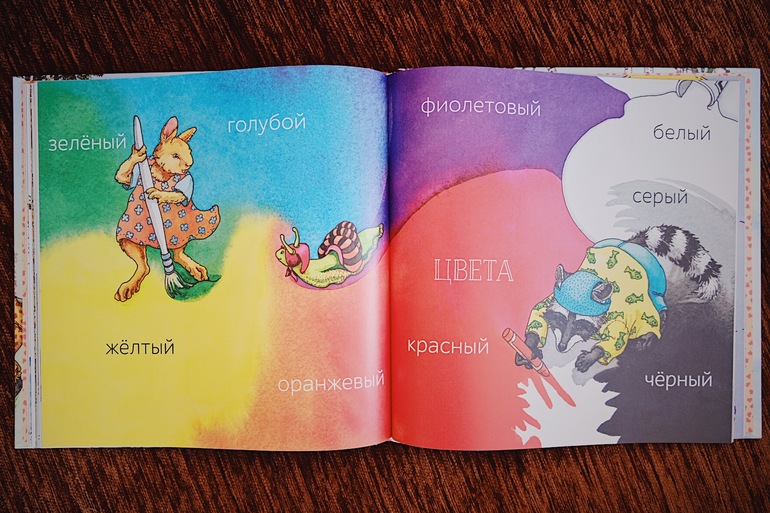 Книга знакомит ребёнка не только с народным фольклором, но и различными цветами, цифрами и буквами, а также, формами предметов, кухонной утварью и даже чувствами человека.