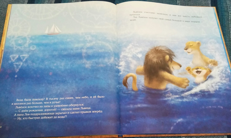 Вот честно, читая первый раз, у меня даже голос дрогнул.. как просто, как мудро, как правильно.. и даже захотелось сказать родителям, что тоже хочу на море) но потом вспомнила, что сама уже родитель и родился тост) пусть же желания наших детей совпадают с нашими возможностями! ) Чудесная добрая книжка с огромным посылом любви к детям ! и рисунки очень подходят, нежная, трогательная гамма, море шикарных волнующих оттенков! милейший обаятельный львенок, мудрая ласковая мама и папа-глава, решительный и любящий свое семейство!