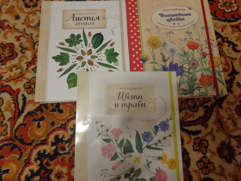 Я счастливая обладательница всех 3 книг-!!! Прекрасно смотрятся вместе! Нашу начинающую коллекцию пока собираем и сушим. Не обходится и без неприятностей - вчера вечером возле соседнего подъезда была замечена настурция - сорвали цветок и листик...и тут нас увидела бабулька с 4 этажа! Неужели я тоже в старости буду такой же жадной и сварливой? Не грядку ж мы у нее выкосили! И не букет насобирали! Пусть завянет через день на грядке, но не станет экспонатом гербария ребенка! Да, согласна, я цветы не садила, но портить настроение себе и людям из-за одного цветка считаю как-то слишком. Для себя сделала вывод - интересующие нас экземпляры нужно собирать по ночам))) (хотя, наверное, соседи дежурят)