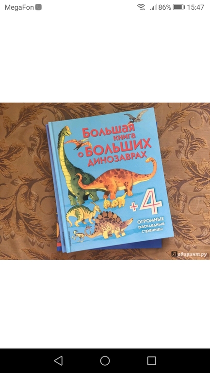 (фото не моё, забыла сделать) На 5 лет оказалась интересной - там огромные 3-разовые развороты, динозавры нарисованы в масштабе с человеком. На некоторых страницах есть задания найти кого-то. Названия - жесть, я и то спотыкалась)) Для искушенных любителей динозавров вряд ли подойдёт, а как первая книга, для поддержания интереса - вполне))