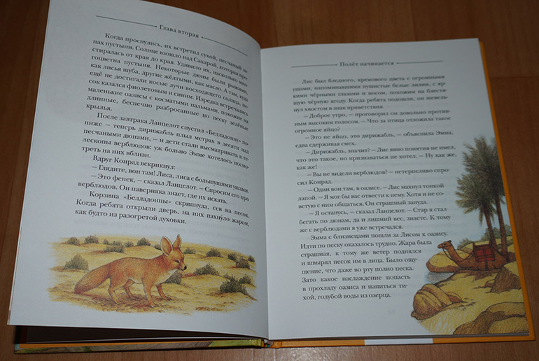 "Солнце взошло над Сахарой, которая простиралась от края и до края. Удивило их, насколько многоцветна пустыня. Некоторые дюны были рыжими, как лисья шуба, другие жёлтыми, как масло. А там, куда еще не достигали косые лучи восходящего солнца, песок казался фиолетовым и синим. Изредка встречались маленькие оазисы с косматыми пальмами, похожие на длинные, беспечно разбросанные по песку зеленые крылья."