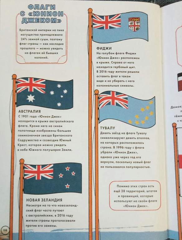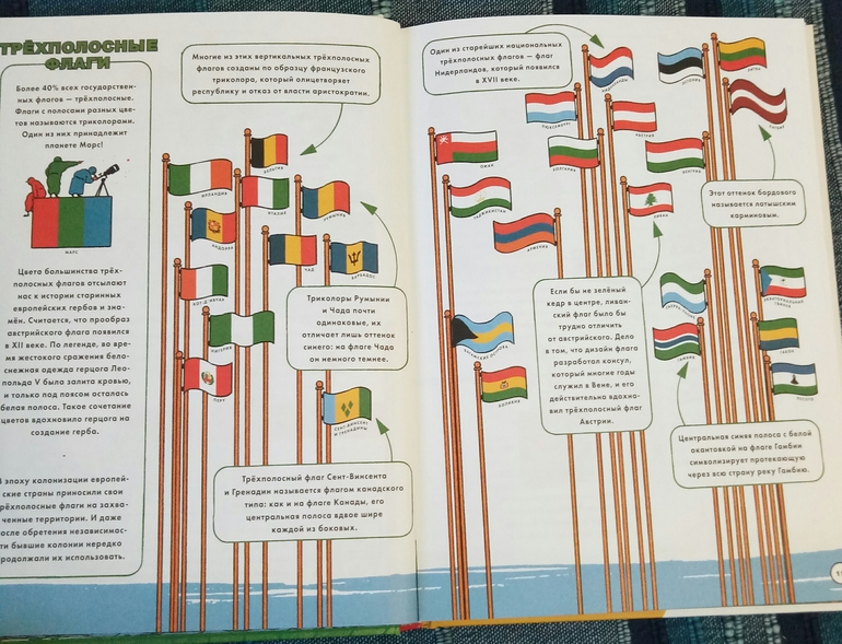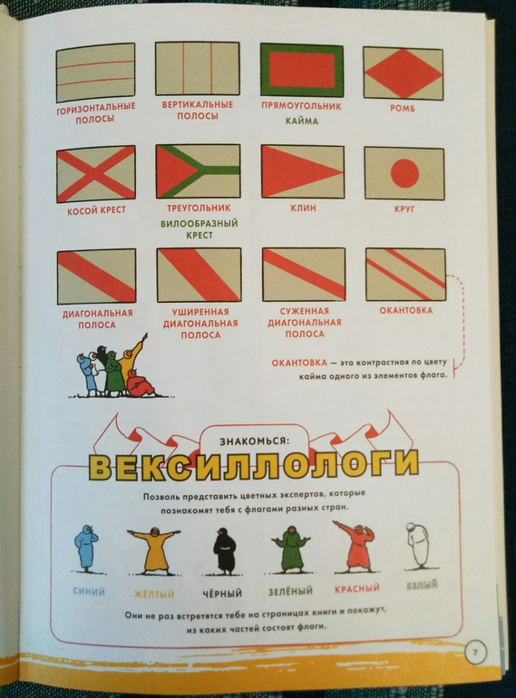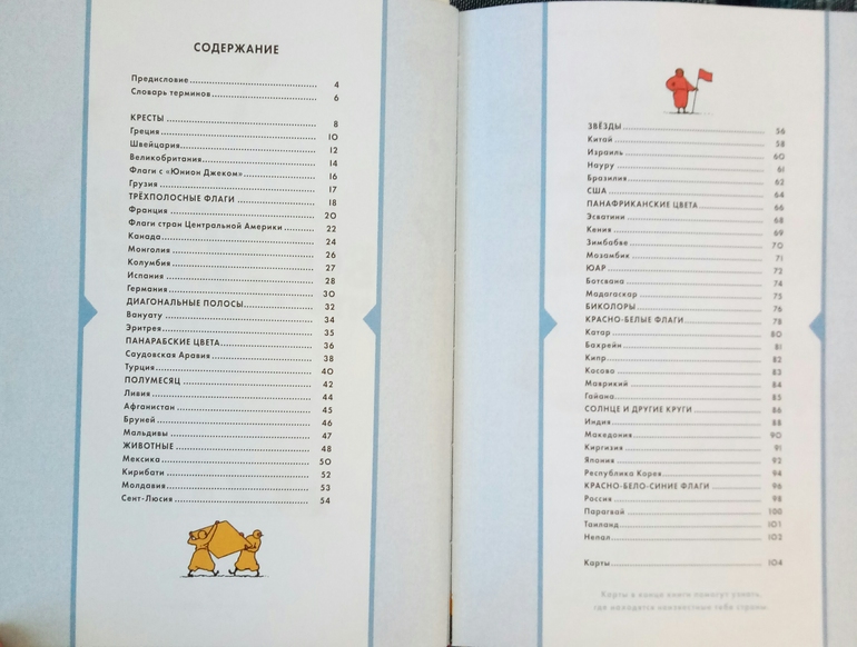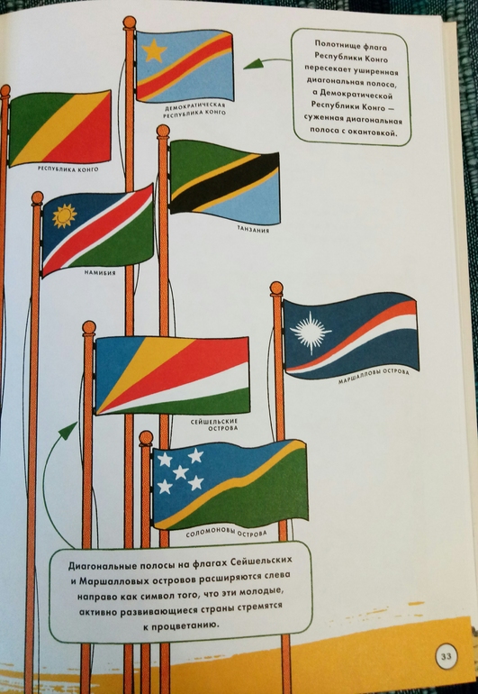 Флаги объединены не по географического признаку, а по тому, что и как изображено на флаге или по цветам флага. Вот содержание, где перечислены все представленные в книге флаги