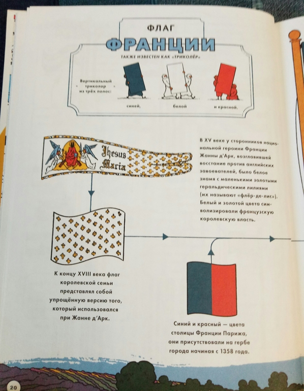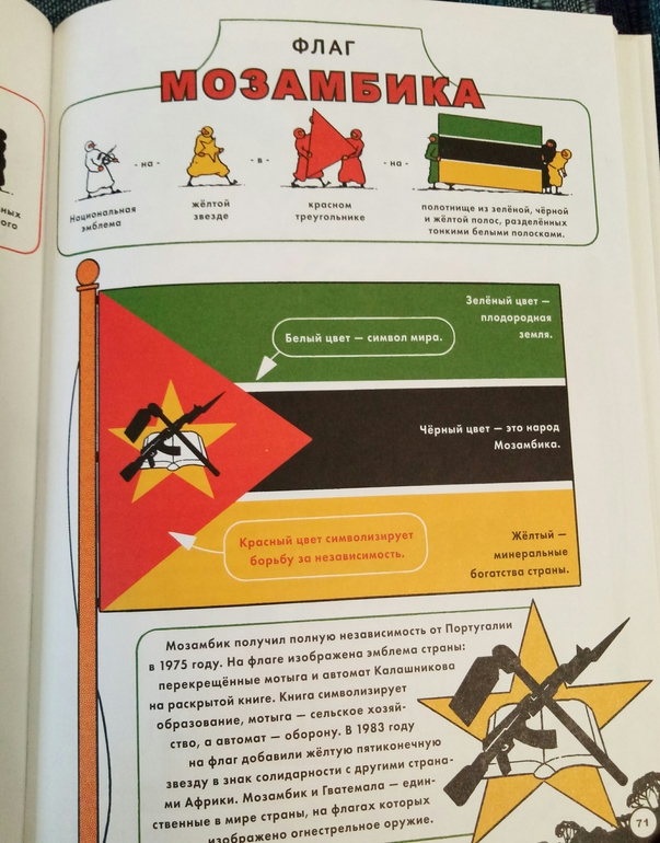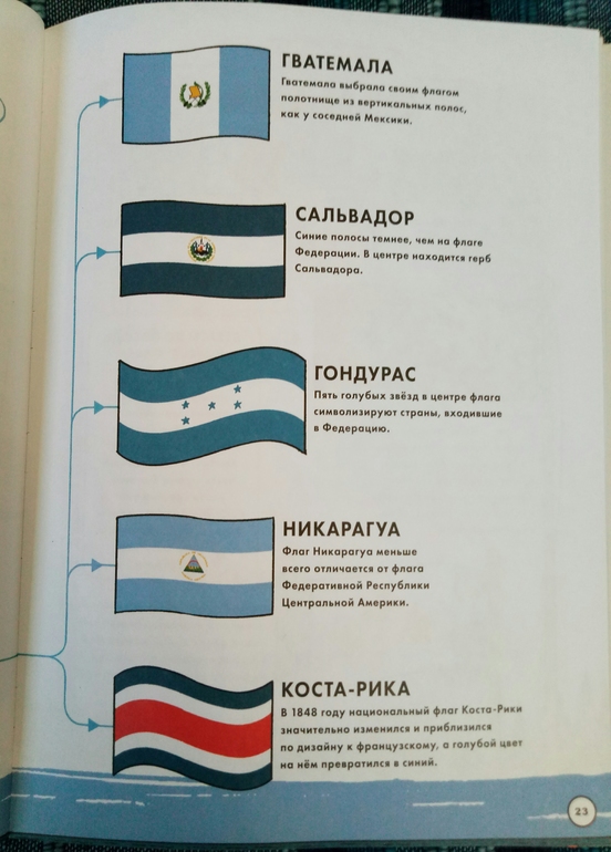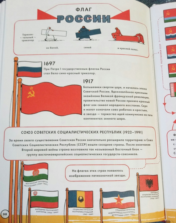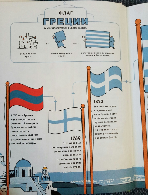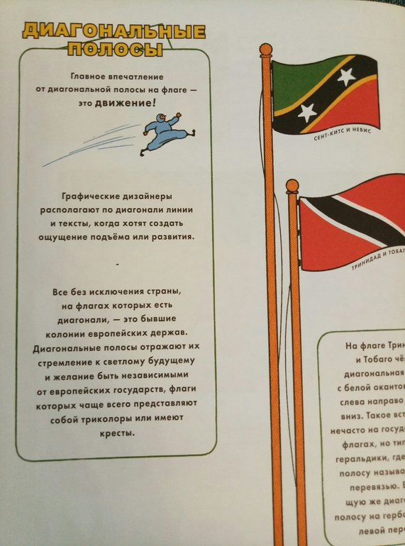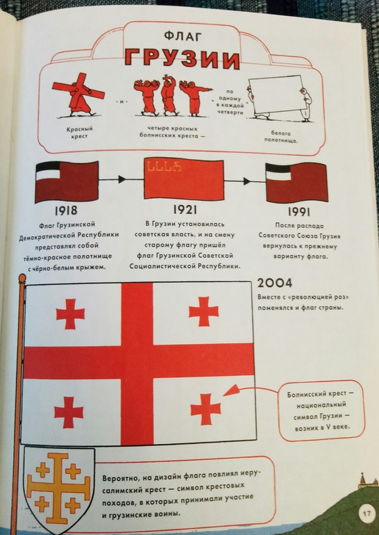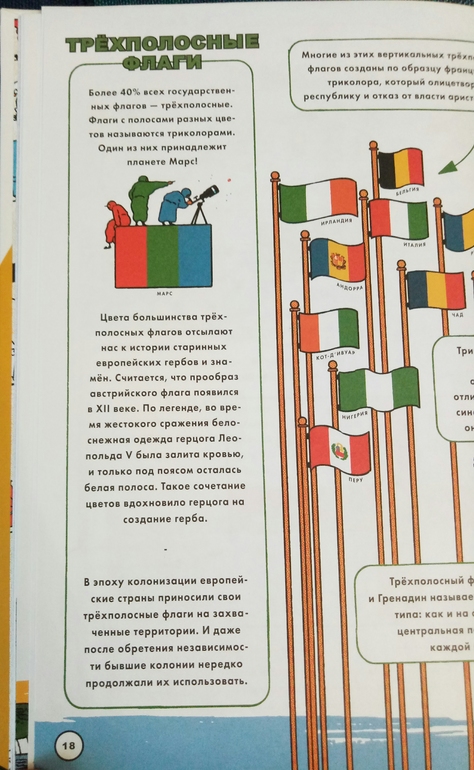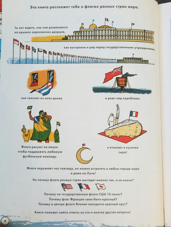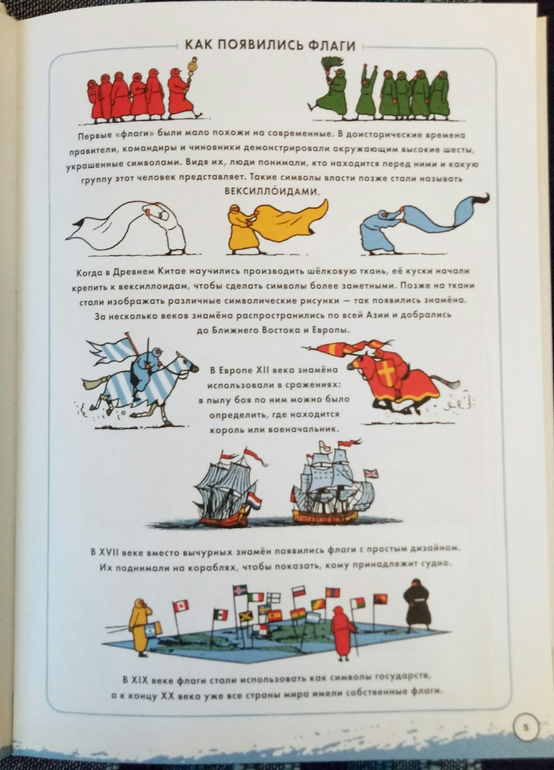 Вообще, конечно, я очень ждала эту книжку, когда шел чемпионат мира по футболу, и все следили за футбольными сражениями команд из разных стран, главным опознавательным знаком которых в турнирных таблицах был именно флаг. Но чемпионат кончился, а интерес к флагам остался, а потом сколько еще впереди соревнований, чемпионатов, олимпиад ! А благодаря этой книге можно научиться не только легко определять чей флаг, а самое интересно как он возник, что на нем изображено и что это значит, и с какими историческими событиями он связан. А флаг с историей совершенно точно легче отложится в памяти, чем просто смотреть и запоминать рисунки с флагами.Начинается книга с того, как вообще появились флаги и где их можно встретить
