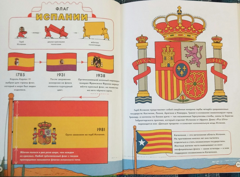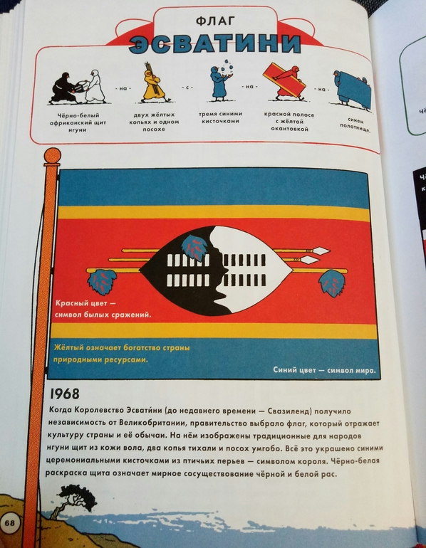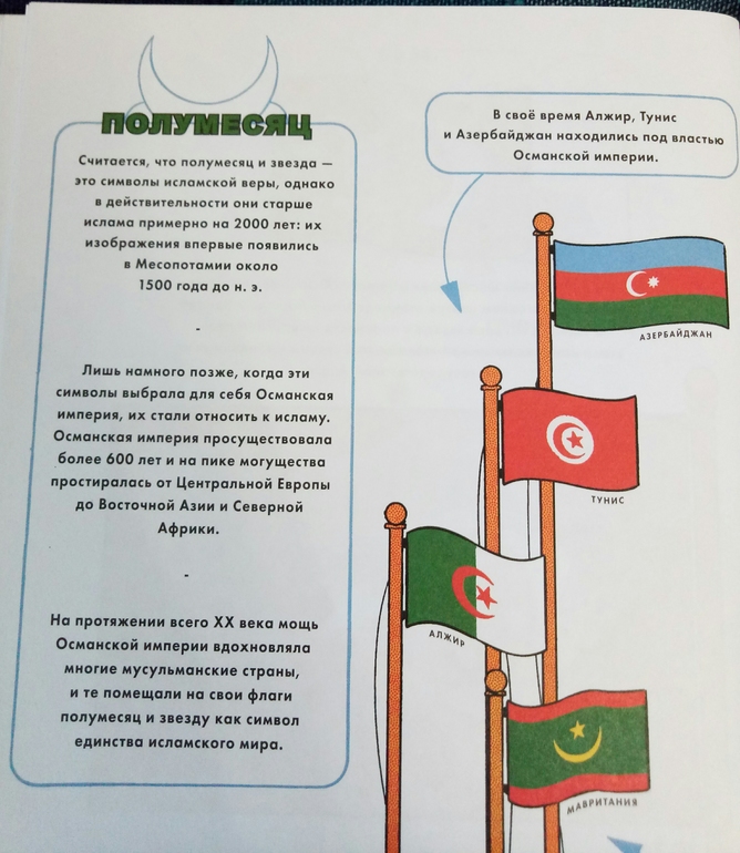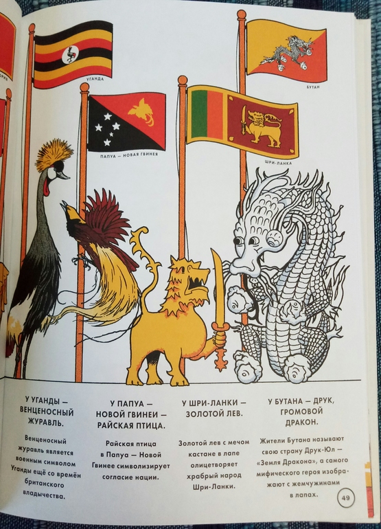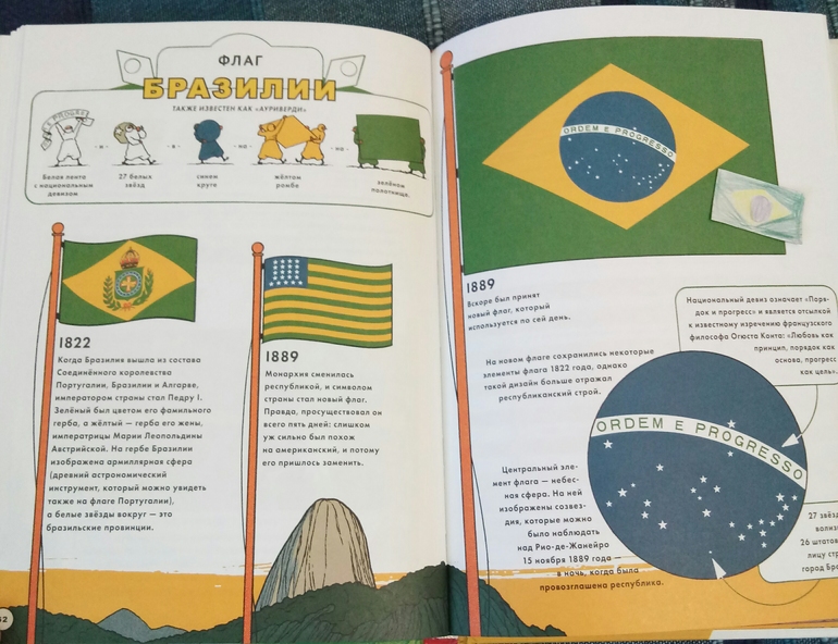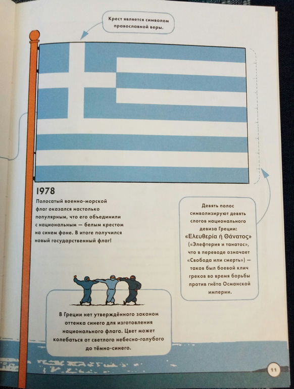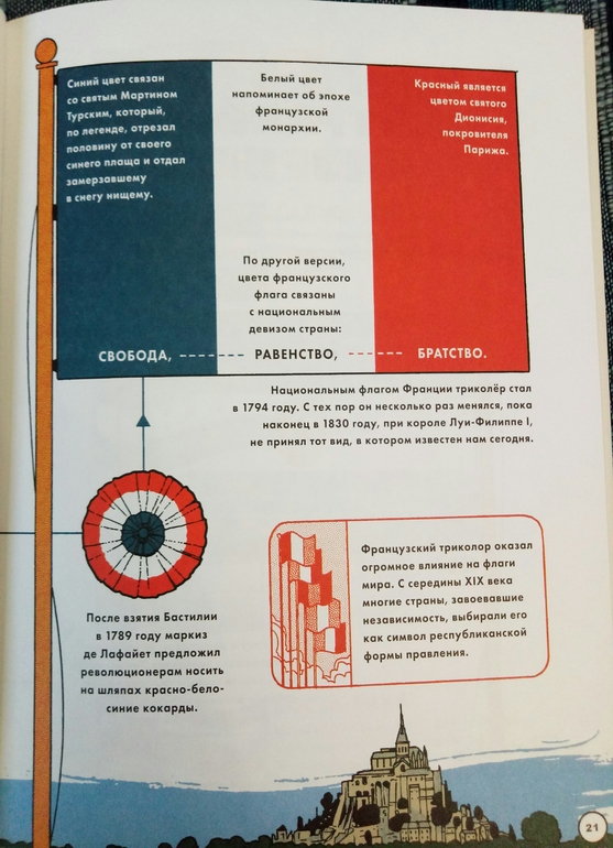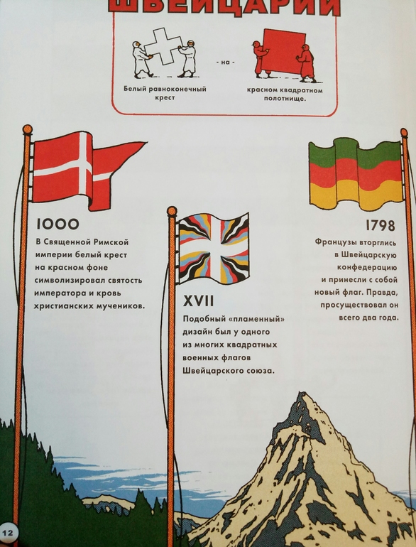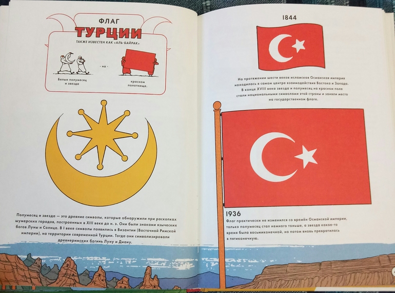 Вообще, конечно, я очень ждала эту книжку, когда шел чемпионат мира по футболу, и все следили за футбольными сражениями команд из разных стран, главным опознавательным знаком которых в турнирных таблицах был именно флаг. Но чемпионат кончился, а интерес к флагам остался, а потом сколько еще впереди соревнований, чемпионатов, олимпиад ! А благодаря этой книге можно научиться не только легко определять чей флаг, а самое интересно как он возник, что на нем изображено и что это значит, и с какими историческими событиями он связан. А флаг с историей совершенно точно легче отложится в памяти, чем просто смотреть и запоминать рисунки с флагами.Начинается книга с того, как вообще появились флаги и где их можно встретить