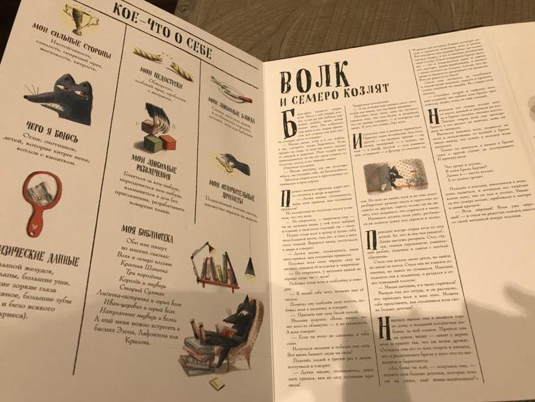 Первый персонаж Волк - идет описание о Волке все его плюсы, заметки о том в каких известных произведениях он упоминается , далее сказка - Волк и семеро козлят