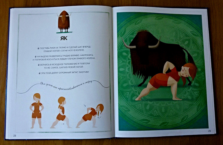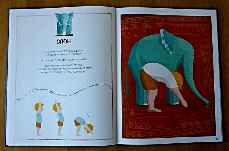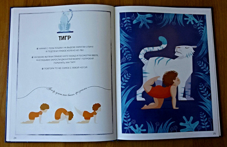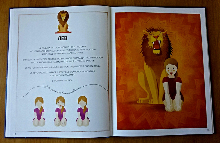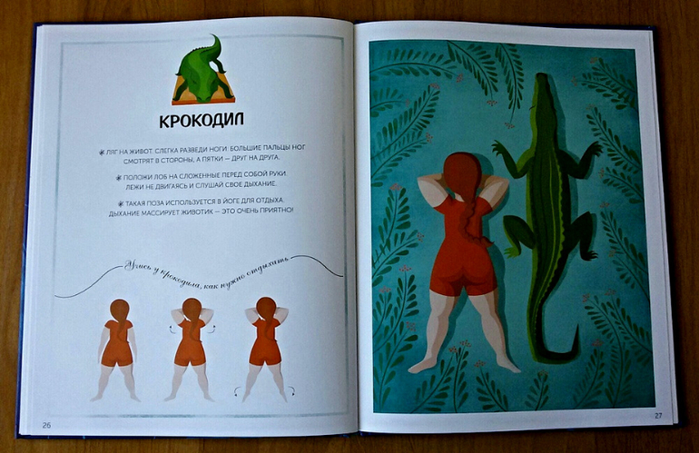 Не читайте эту книгу на ночь. Иначе дети начнут выгибаться как кошки, скакать как саранча и трубить как слоны. Зато она отлично подойдет, чтобы начать с нее прекрасный день. Мы теперь в обязательном порядке каждое утро выделяем 15 минут для йоги. Дети воспринимают это как игру, они надолго не задерживаются в одной позе, практически сразу требуют следующую. Но даже в таком режиме это приносит несомненную пользу. Лично у меня стала меньше болеть спина, трехлетний сын начал выполнять все упражнения. Хотя в начале делал только Слона и Льва, а остальные категорически игнорировал. А дочка освоила самую сложную, на мой взгляд, позу Черепахи. Правда, первые несколько раз она в ней застревала и нам приходилось, в прямом смысле слова, ее распутывать.