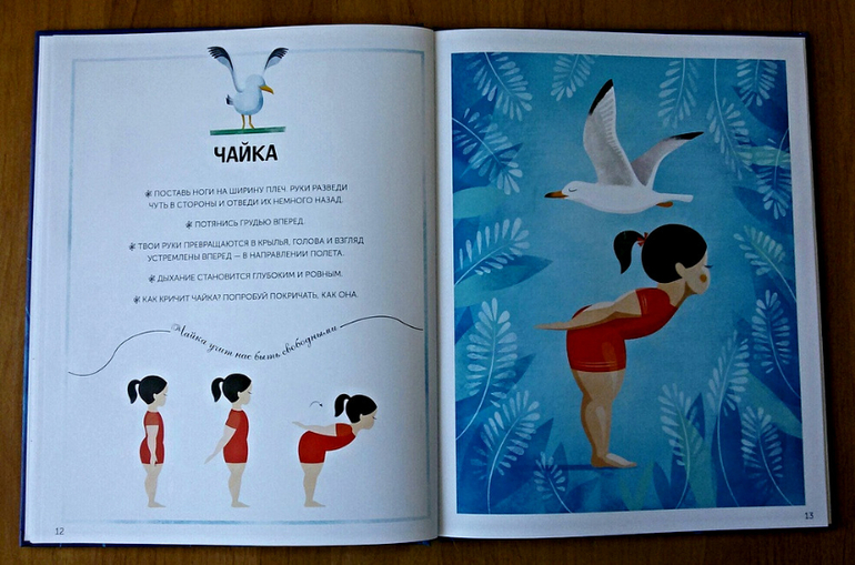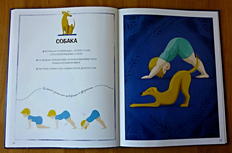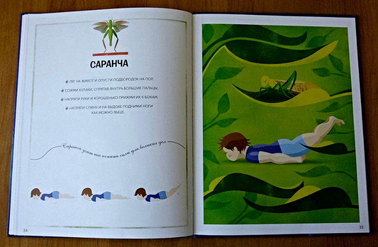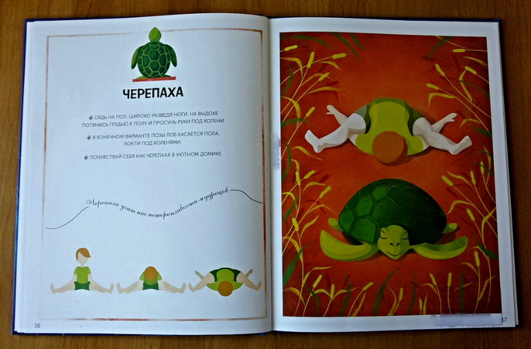 Всего в книге шестнадцать асанов, есть совсем легкие, есть посложнее. Но, как показала практика, дети способны справиться со всеми, а вот многим взрослым придется попотеть над позой Черепахи. Сколько я не стараюсь, выполнить у меня ее не получается.