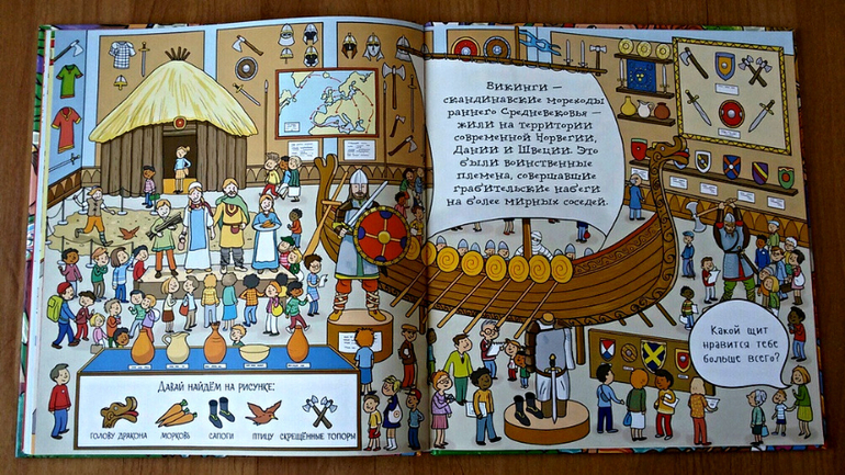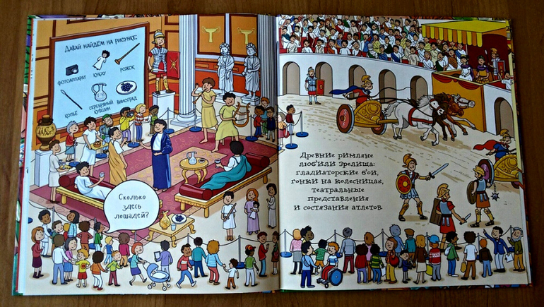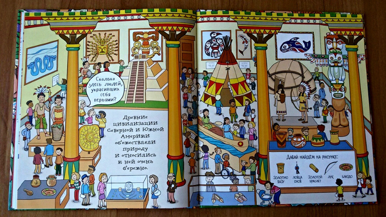 Также на каждом развороте среди людей, экспонатов и вещей спряталась хитрая мумия, которую тоже надо найти. Иногда это оказывается достаточно сложно. В некоторых заданиях дети просили поискать вместе с ними.
