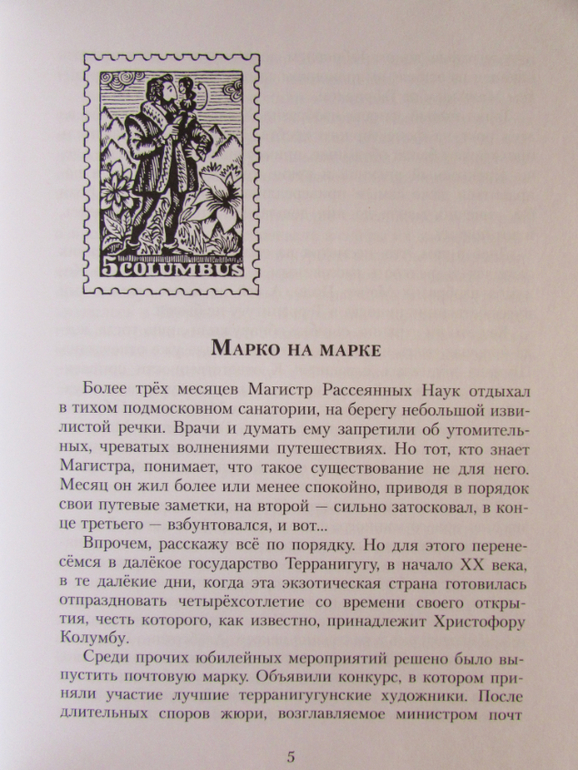 Нерадивый художник из далёкой страны Терранигугу изобразил на марке вместо Христофора Колумба другого знаменитого путешественника, Марко Поло. Из-за этой ошибки был уничтожен весь уже напечатанный тираж марок, кроме двух, случайно оставшихся. Спустя время одну из марок похищают.