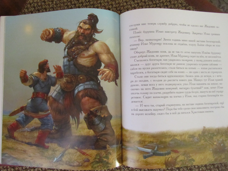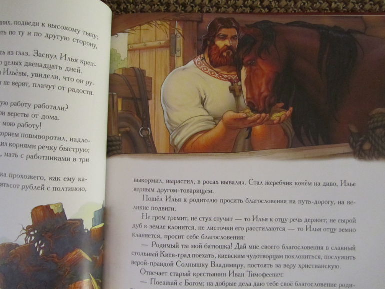 Я вспомнила, что у меня ещё припасена книга про Илью из этой же серии, но в твердой обложке )) И вот знаете текст хоть и адапт , а очень простой, всё было сыну понятно, мне прям понравилось изложение, без спотыканий, вполне себе хороший текст. В книге из фикс прайса нет сносок с непонятными словами, а здесь в "твердой версии"они есть, очень интересно было почитать, но самой конечно, сыну эта информация пока не к чему. И опять же как ив Добрыне иллюстрации шикарные, настоящие богатыри, всё как надо. В книге семь глав-историй про Илью, но содержания нет (( Самая интересная конечно про Соловья-разбойника, жестокость присутствует в некоторых моментах, я кое-что опускала. А так я вообще изначально не собиралась читать, думала, картинки будем разглядывать. но для первого знакомста с русскими богатырями вполне себе ничего )) Я подумываю теперь и про Алешу прикупить, хотя бука с ним есть, но как тут удержаться перед такими яркими образами богатырей ))