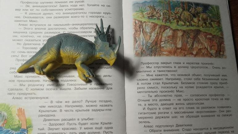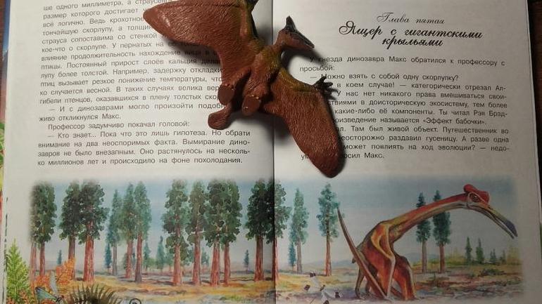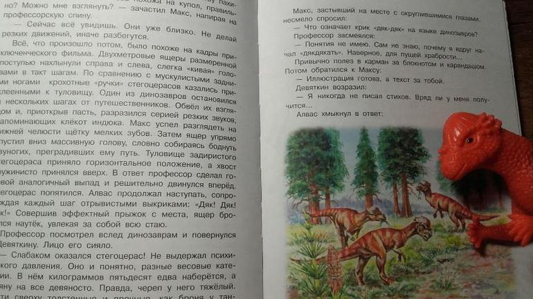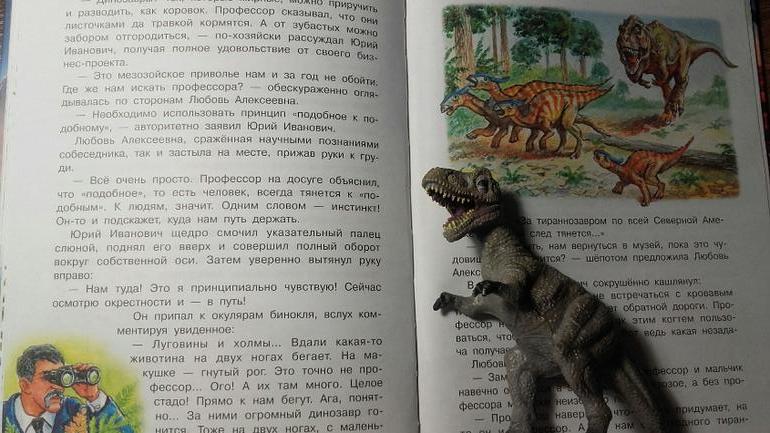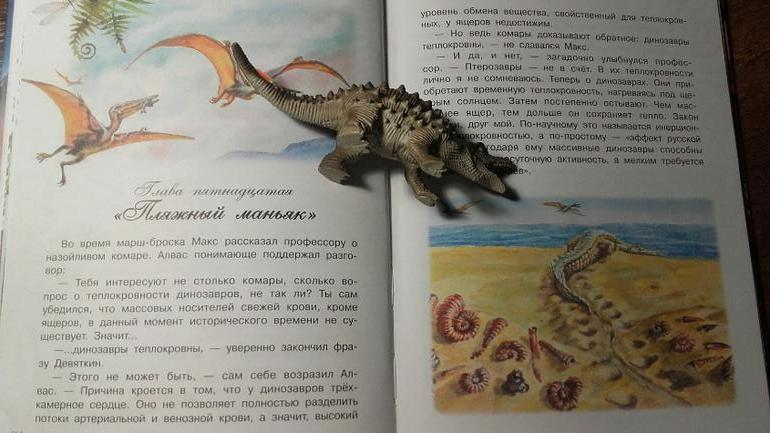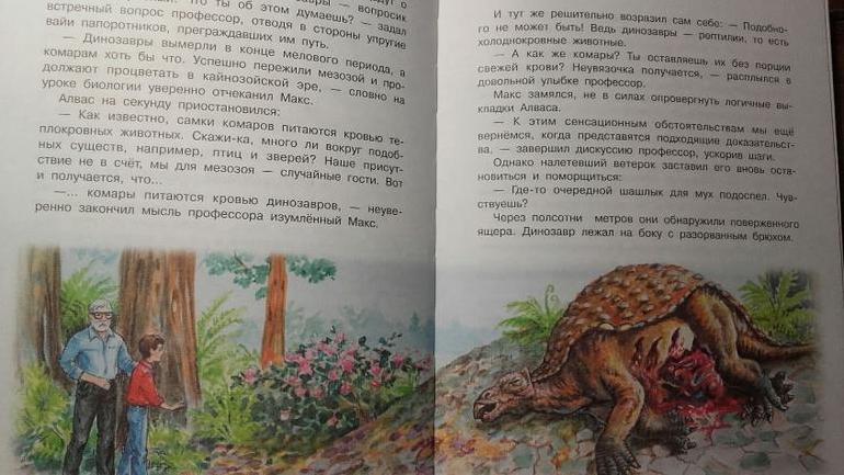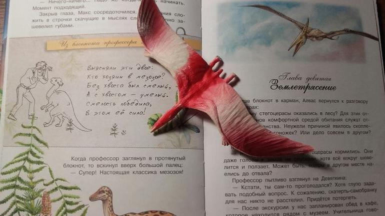 Самая большая фишка конечно, что действие происходит в Москве, в музее, в который реально можно съездить и помечтать, что там действительно есть портал, мальчик обычный школьник Максим, ученик 5 класса (т.е. это 10-11 лет), это очень подкупает)) Книга написана живым языком, в ней собраны энциклопедические сведения, но поданные с такой легкостью, что воспринимаются легко и запоминаются тоже. Мне казалось нас уже ни чем не удивить после бесконечных энциклопедий и художественных книг, но нет, например, профессор озвучивает теорию исчезновения динозавров. Динозавры могли погибнуть всвязи с тем, что похолодание на планете повлияло на вынашивание яиц внури тела, что увеличило их плотноть и после откладывания не позволило зародышам прорезать себе скорлупу, т.е. они просто погибали внутри, не появлялись новые динозавры, а оставшие просто постепенно умирали от голода, холода, съеденные и от старости. Очень интересная теория, первый раз о ней читала. Также есть и другие теории, описанные в книге. Много информации о флоре того периода, нравится то, что они просто наблюдатели, нет сказочного взаимодействия. Сын сказал эта книга интереснее Даррела (показывала тут). Также каждую главу сопровождают зарисовки и стишки профессора)) Хоть книга и расчитана на детей 9-12 лет, но иллюстраций в книге более чем достаточно. Книга предназначена для среднего школьного возраста, потому что в ней много детальной научной информации о динозаврах, биологии, но мой 6тилетка прослушал ее с удовольствием, что-то может и не понял, но на все мои вопросы отвечал и содержание хорошо запомнил. Попутно задавал вопросы, но не много, очень уж интересный сюжет не до вопросов. Книга будет очень интересна школьникам в процессе обучения. Рассказывается про пищевые цепи, их влияние и много еще чего интересного.