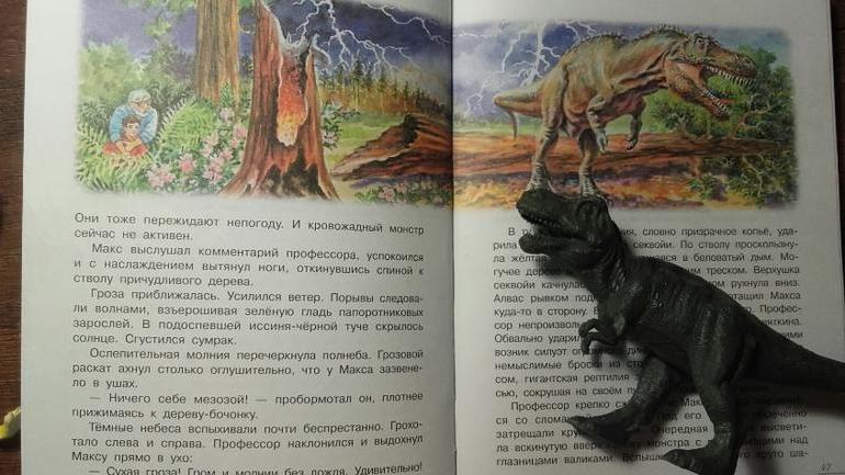 Хочу предупредить, что есть описания как хищник поедает мирного динозавра, как он тухнет на воздухе, как копашаться и доедают его жуки, ничего в этом страшного не вижу, это естественный процесс, но для 6тилетки немного меняла и упрощала текст.