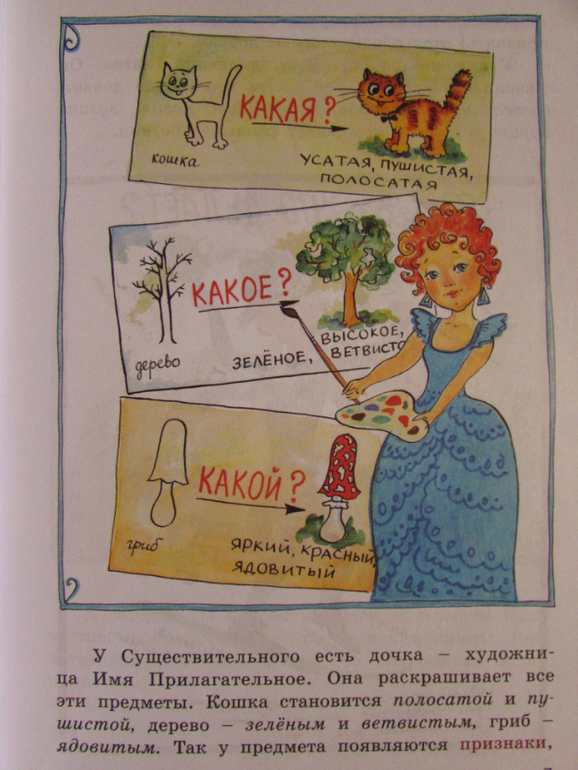 Она художница и ее зовут Имя Прилагательное. Она раскрашивает все предметы. Кошка становится полосатой и пушистой, а дерево - зеленым и ветвистым.
