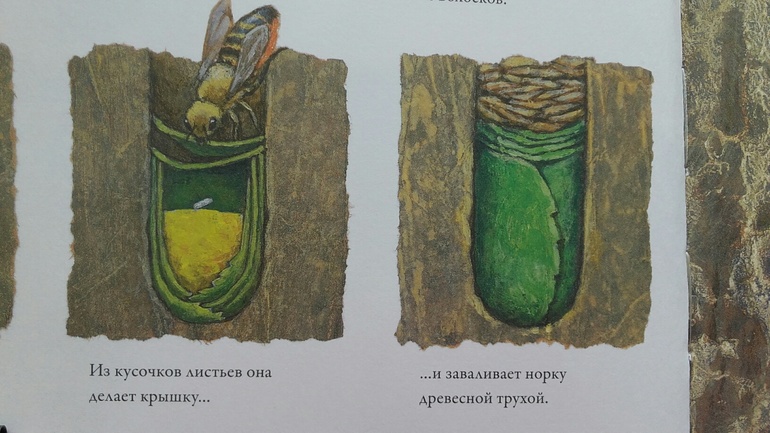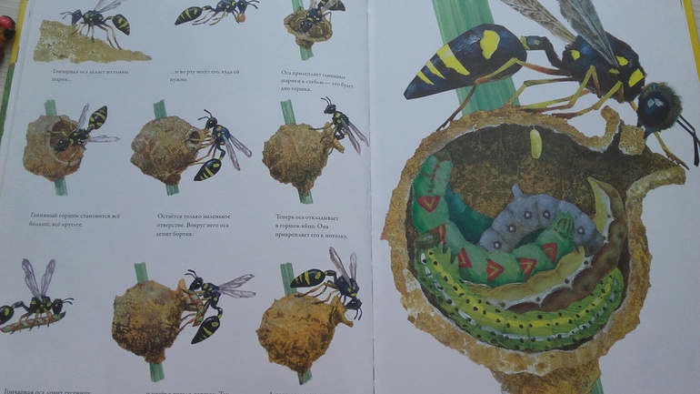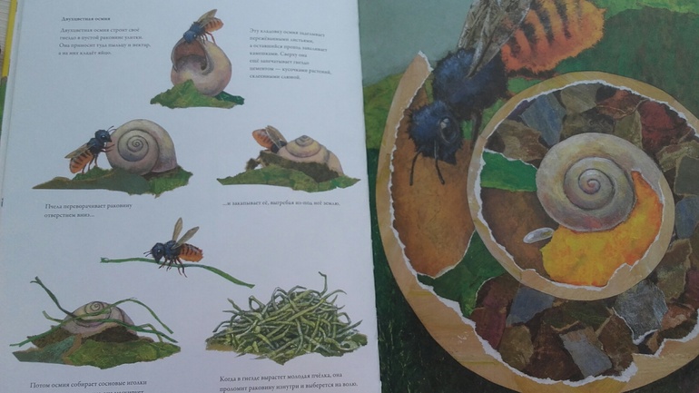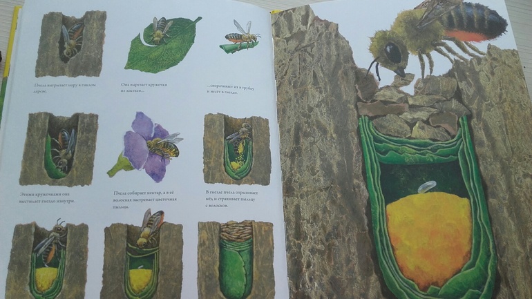Начну с того, что сына укусила пчела и теперь он боится всех жужжжжжжащих и шипящих в том числе)) но вот думала-гадала как нам поближе познакомиться с пчелами и тут такая удача. В книге рассказано и показано как живут пчелы, осы, другие насекомые, но не просто рассказано, а подробно показаны их гнезда изнутри!!!! Рассказаны и показаны этапы их создания!!