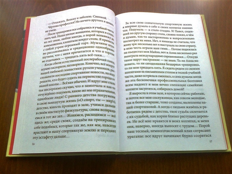 Повесть сравнительно небольшая, читается очень легко. Симпатии возникли к обеим героиням, потому что автору они тоже явно симпатичны, это чувствуется. Размышления, переживания, чувства описаны очень естественно, мы мыслим точно так же, так же мечтаем и действуем, порой не отдавая себе отчёт в том, что мы НА САМОМ ДЕЛЕ делаем и для чего, а иногда просто не признаваясь себе в том, что поступаем дурно. Вот и книга получилась на самом деле не только о спорте, а о том, СТОИТ ЛИ ОНО ТОГО? То, чем мы занимаемся, на что тратим много времени и сил? Не пожалеем ли? Ведь жизнь такая короткая, и проходит она очень быстро. Что важнее - родной человек или спортивные (или иные) достижения?