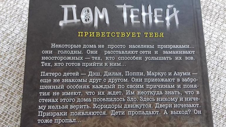 Потянуло мою девочку на страшилки. Увидела в магазине книжку "Дом теней", загорелось купить)) Если честно, очень классно оформленная книжка,действительно притягивает и заинтересовывает уже даже обложкой( которая с дыркой!):