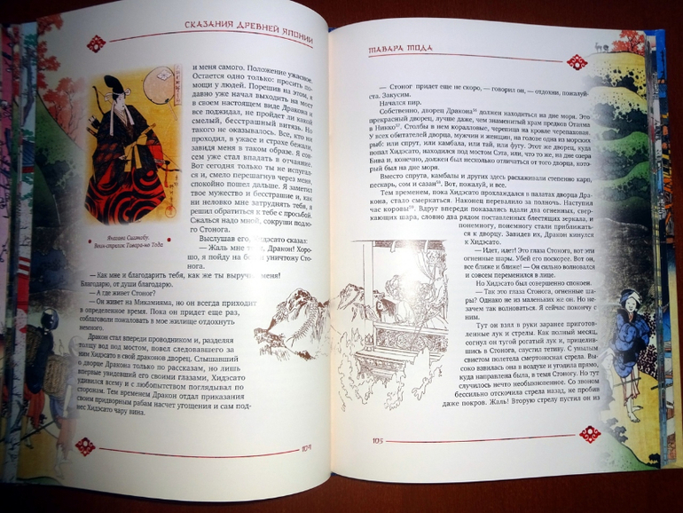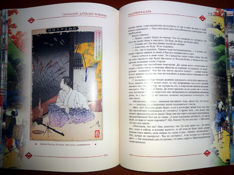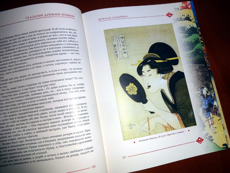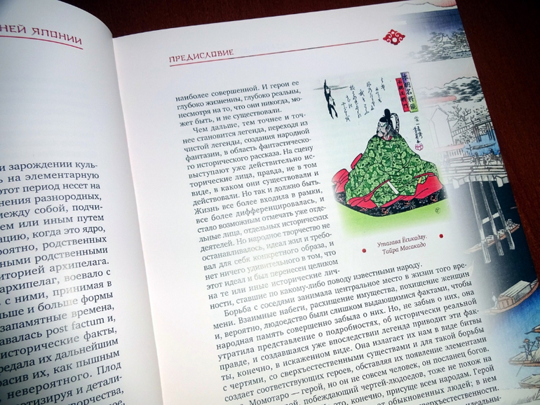 Оформление довольно типичное для ОлмаМедиаГрупп - меловка, рамочки, но последние не жесткие, ограничивающие текст, а оформленные довольно затейливым рисунком. Вообще книга выглядит очень стильной. Нет ни одной пустой страницы, текст сопровождают либо монохромные рисунки - нет, не черно-белые, а скорее коричнево-бежевые, либо "оригинальные рисунки японских художников и издания А.Ф. Девриена, 1908 г.".