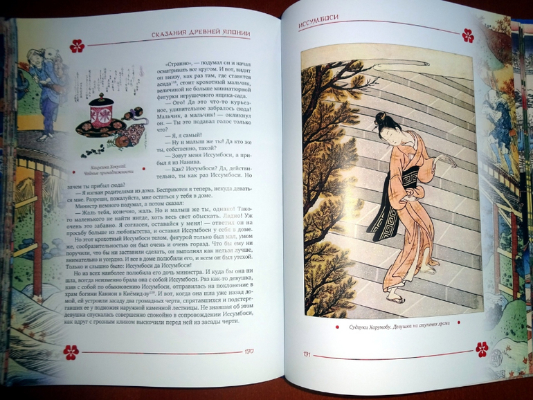 "Много времени тому назад в провинции Сэтцу, в деревне Нанива, которая превратилась ныне в город Осака, жили-были старик да старуха. Жили себе старики вдвоем да поживали, одна только беда и была у них: детей они не имели, ни одного. Они думали только об одном, только одного и желали - чтобы у них появилось дитя. Неважно там, какое дитя, хоть бы с кончик пальца величиною, и то хорошо - думали они. Но как ни желали они этого, как ни мечтали, а дитя нет как нет. Оставалось только одно - обратиться к божеству, просить его помощи. И вот, посоветовавшись между собой, отправились они на поклонение к Сумиёскому божеству, которое оба чтили, и, преклонив колена, вознесли ему горячие мольбы свои.