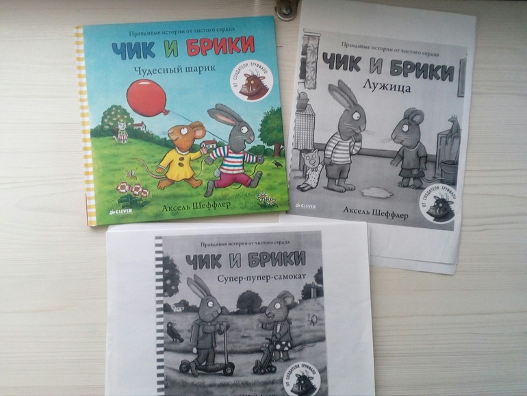 А вот истории про Чика и Брики в определенный момент дали нам новый толчок в любви к чтению. Это было, наверное, как раз полгода назад. Я решила попробовать и не прогадала. Сначала мы просто читали книгу про шарик, потом стали рассматривать детали, и при последующем чтении Макс каждый раз обращал внимание, где огрызок яблока валяется, где жучок какой-то и тд. Еще 2 книги я распечатала, тоже читали с интересом. А потом мы как-то их подзабыли. Надо будет попробовать еще раз их почитать, и еще может новые распечатать.