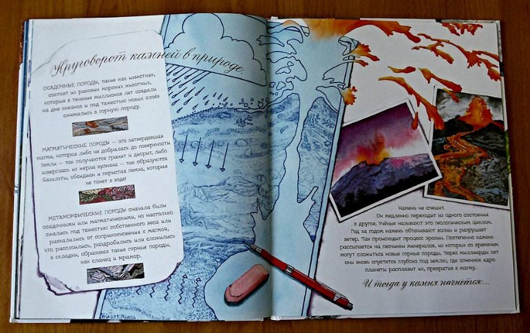 Несмотря на то, что в книге представлено буквально несколько познавательных фактов о камнях, парочка из них была для меня удивительным и интересным открытием. Например, я не знала, что камни плавятся. А температура их плавления составляет от 700 до 1300 градусов Цельсия.