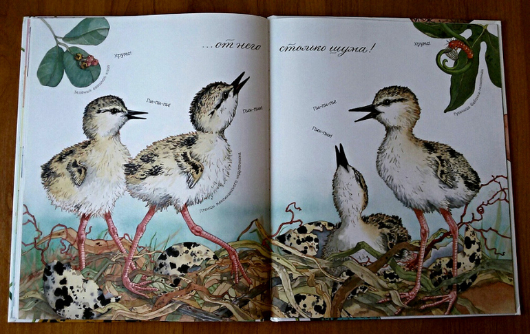 В книге показано как развивается эмбрион внутри яйца, как благодаря своей расцветке некоторые яйца сливаются с окружающей средой. "Такая маскировка - хороший способ не попасть в лапы хищников". Природа максимально позаботилась о сохранении жизни на земле. И дала маме возможность побыть немного в тишине, пока не треснет скорлупа и не начнется несмолкаемый шум и гам.