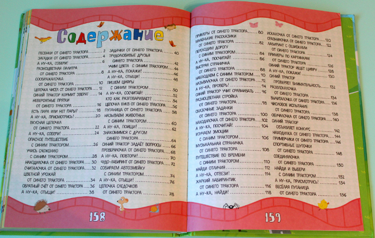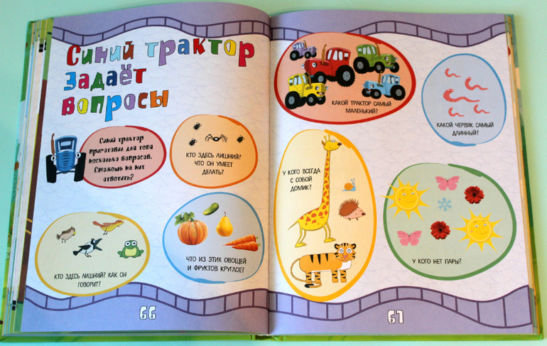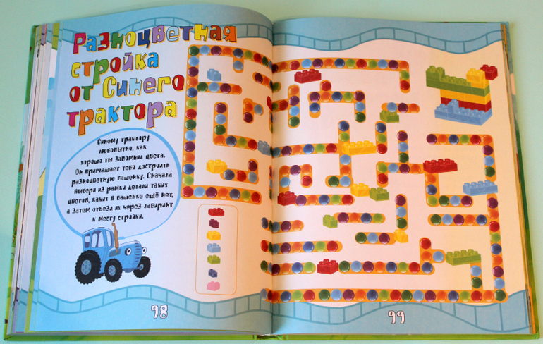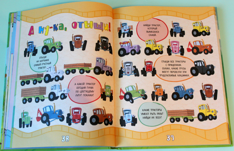 Книга формата А4, твёрдый переплёт, плотный офсет, 160 страниц, довольно тяжёленькая, внутри яркие цвета и много-много тракторов!) Для поклонников мультфильма станет хорошим подарком! Но! Предупреждаю сразу, заданий в книге не 1000, а намного меньше, знаю, что для кого-то это важно.)