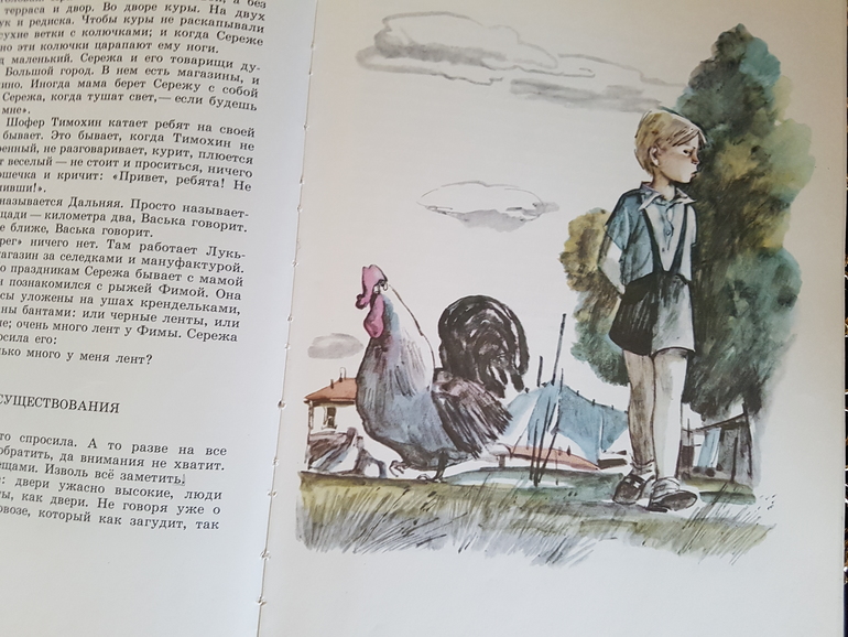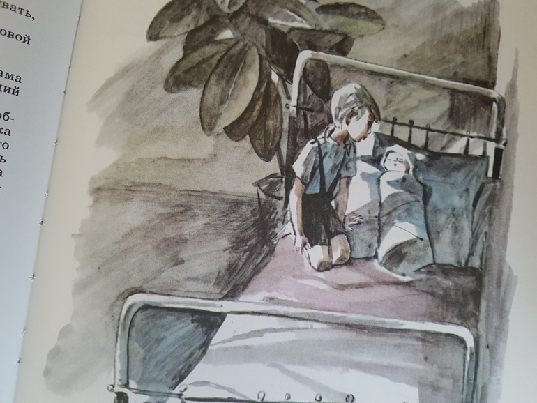 Сережа смотрит во все глаза, поднявшись на цыпочки… Но из серой коробки, где могло бы поместиться что-нибудь замечательное, появляется пара огромных черных суконных бот с резиновым ободком.