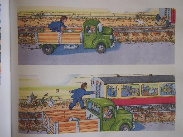 По возвращению из отпуска сын целыми днями катает паровозик Лего и теперь мы с ним играем с паровозиком по мотивам первого рассказа. Наш паровозик убегает от Даффи (человечка Лего), а тот пытается догнать его на грузовике, лодке, тракторе и т.д.
