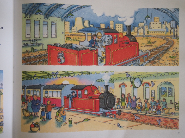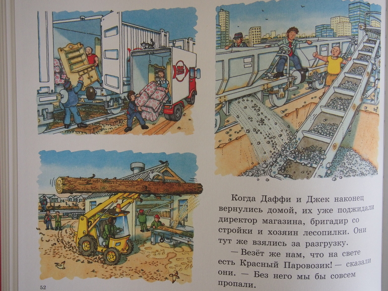 В рассказе "Паровозик-великан" Красный Паровозик выручает строителей, директора мебельного магазина и хозяина лесопилки, вовремя доставив им нужные грузы - гравий из каменного карьера, контейнеры с мебелью из морской гавани и бревна с лесопилки.