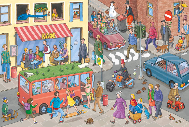 Книга расскажет об одном дне из жизни двух десятков главных героев - всех их нужно отыскать на каждом развороте книги. Кто-то из них ходит пешком, кто-то передвигается на машине, но их маршруты то и дело пересекаются, сюжетные линии перекрещиваются, складываясь в единую историю.