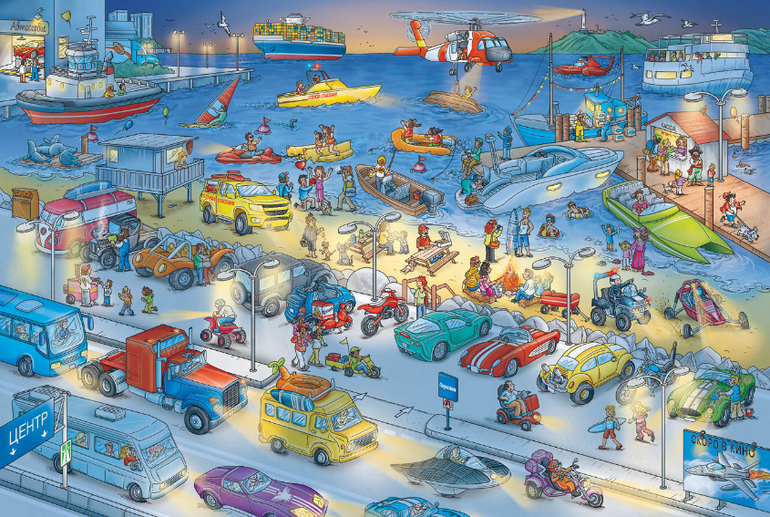 Виммельбух - книга на любой возраст. Самые маленькие с удовольствием рассматривают яркие крупные объекты, дети постарше с азартом выполняют задания по поиску персонажей на каждом развороте, а наиболее продвинутые читатели (включая и взрослых) подмечают самые мелкие детали и находят «шутки художника» без которых не обходится ни один виммельбух.