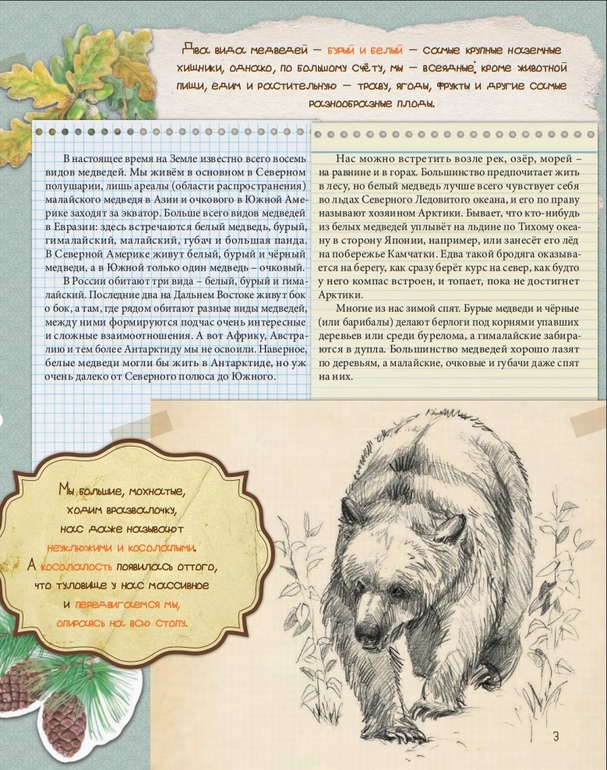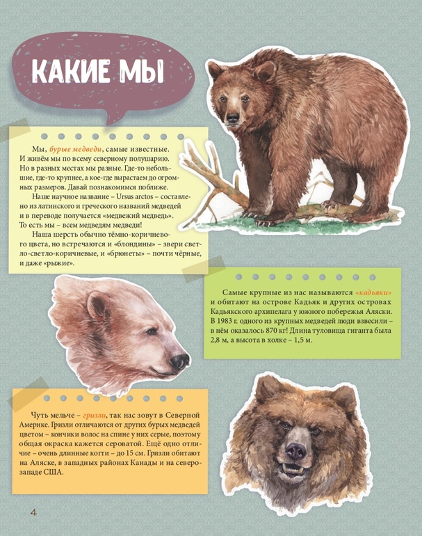 Почему медведи косолапят? Какой из медведей самый сильный? А самый умный? Как отличить гималайского медведя от барибала? Почему белый медведь не мёрзнет? Кто из медведей строит на деревьях гнёзда? Всё это и многое другое ты узнаешь из нашей книжки. Медведи сами откроют тебе свои тайны и секреты. Они расскажут как понять их настроение, от кого они произошли, как устроены их глаза и лапы, и поделятся правилами воспитания медвежат. А еще ты сможешь узнать о том, каким медведем тебе удалось бы оказаться.
