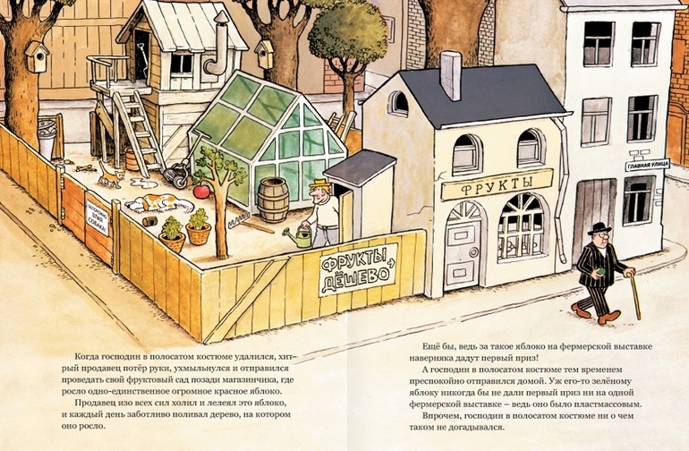 Это остроумная и вместе с тем поучительная история о том, как один хитрый продавец фруктов решил облапошить простодушного покупателя и подсунул ему пластмассовое зеленое яблоко вместо настоящего, посоветовав не есть яблоко сразу, а немного подержать его на солнышке, чтобы "дозрело". Ничего не подозревающий о коварстве продавца господин в полосатом костюме, купивший яблоко, пришел домой и, как было велено, положил яблоко на подоконник, после чего так увлекся работой, что не заметил, как его попугай подлетел к окну и случайно столкнул фальшивое яблоко с подоконника… Это повлекло за собой целую цепочку событий, в результате чего на подоконнике у простодушного господина в полосатом костюме оказалось самое настоящее красное спелое яблоко, причем ровно в тот момент, когда он, закончив свою работу, решил перекусить…