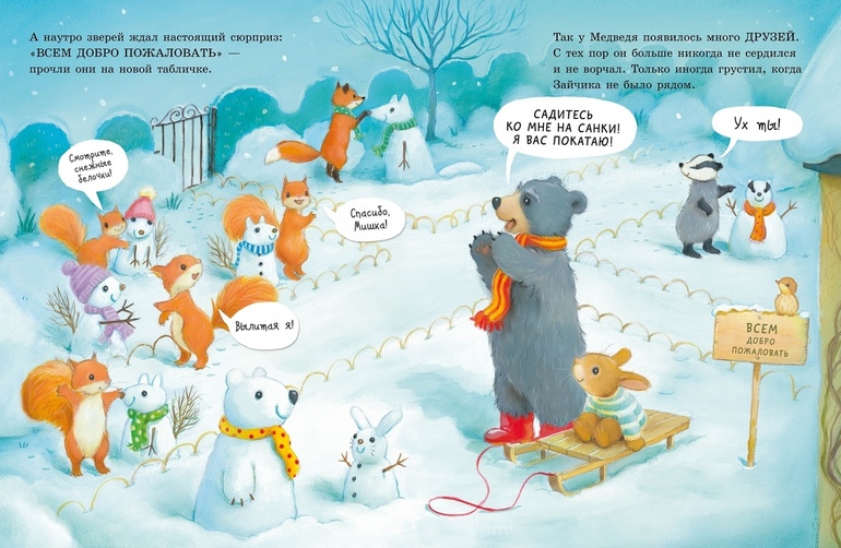 Все звери боялись Медведя - все, кроме одного маленького улыбчивого зайчика. "Бедный, бедный Медведь, - думал Зайчик. Грустно ему, наверное, живется одному. Вот бы его чем-нибудь порадовать!" И он решил слепить в медвежьем саду снеговика надеясь, что Медведю понравится сюрприз. Но не тут-то было! Вместо того, чтобы обрадоваться такому подарку, Медведь пришел в ярость оттого, что кто-то без спроса пробрался в его любимый сад.
