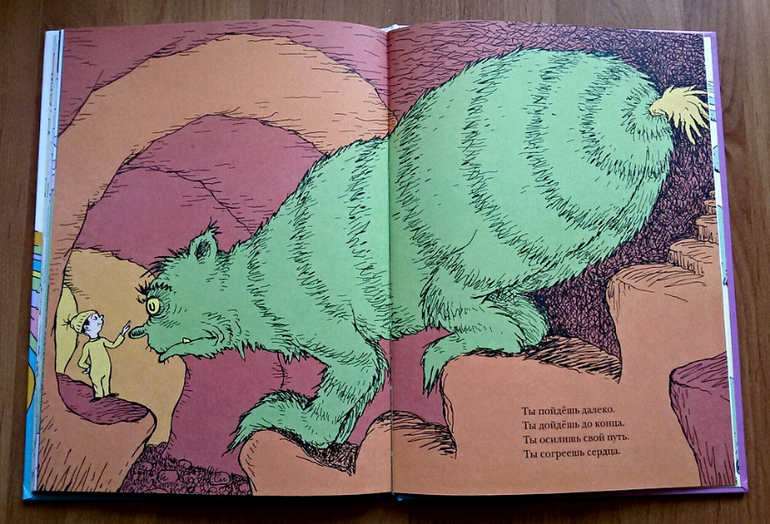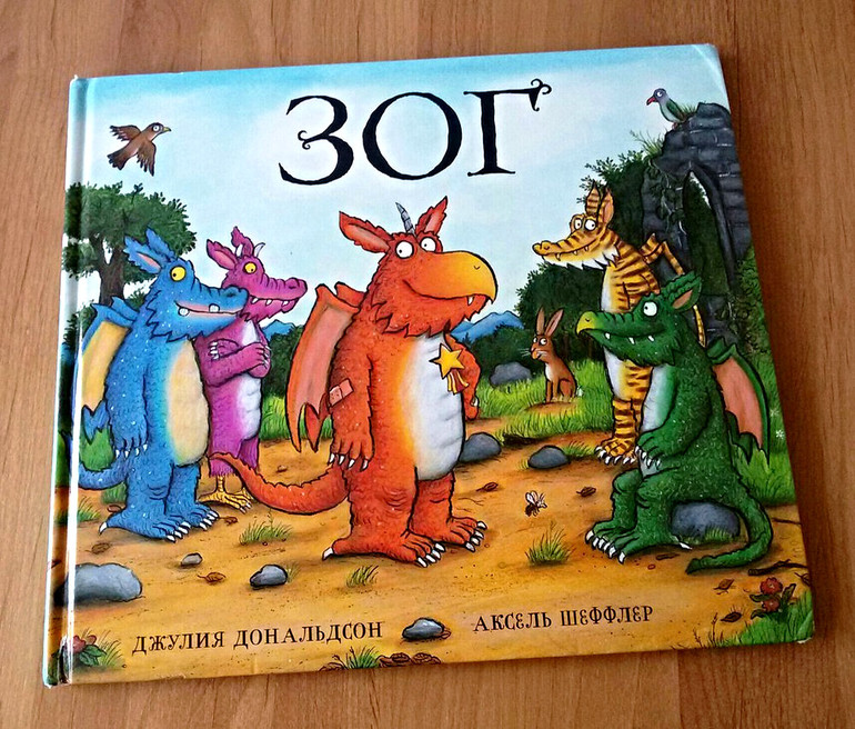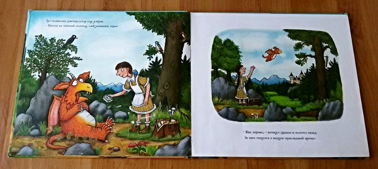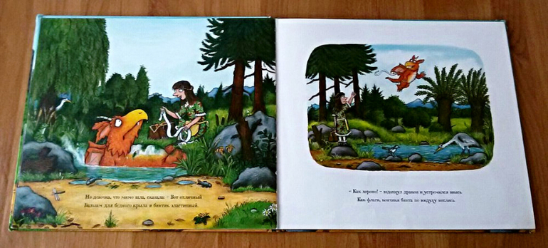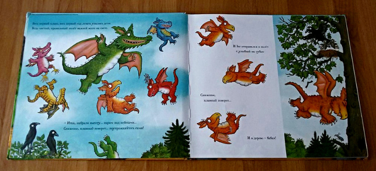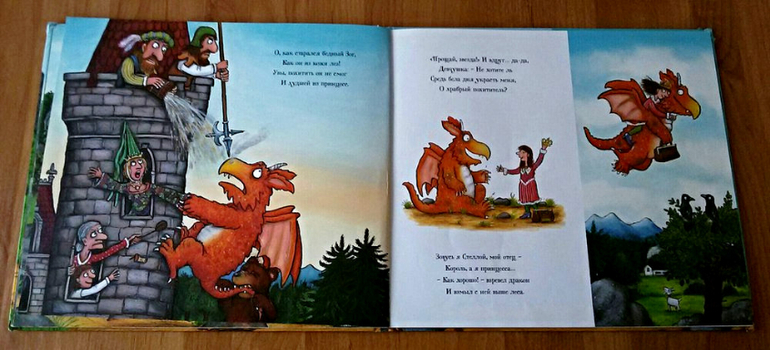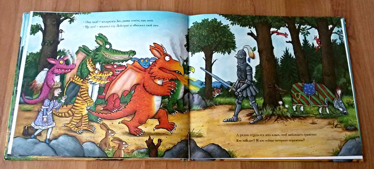 Очередной шедевр от Джулии Дональдсон. Так долго на первых разворотах мы не застревали никогда. Дети очень оживленно спорили, какого цвета дракон самый красивый. Расходились во мнении, ругались, толкались, приходили к согласию и все это только до следующего разворота. Как только переворачивалась новая страница, все начиналось сначала.
