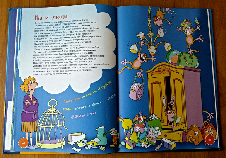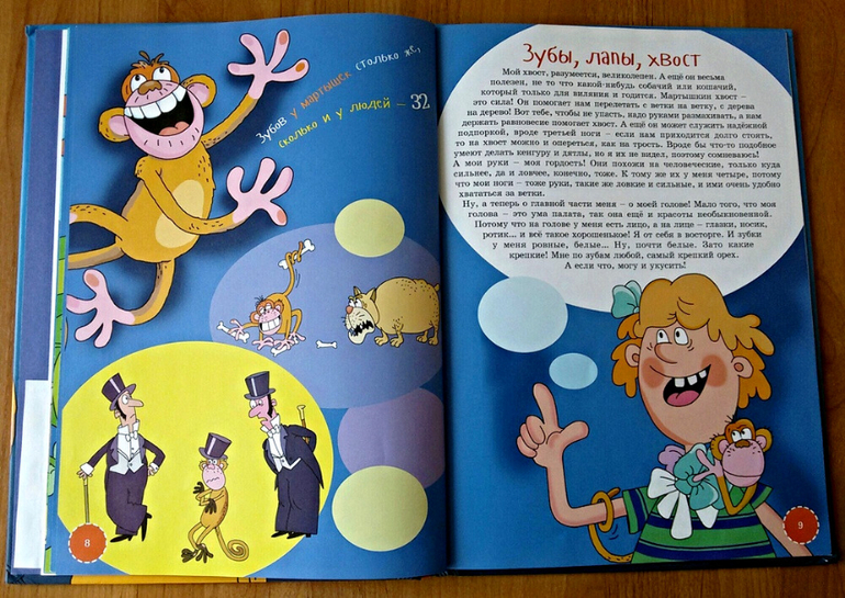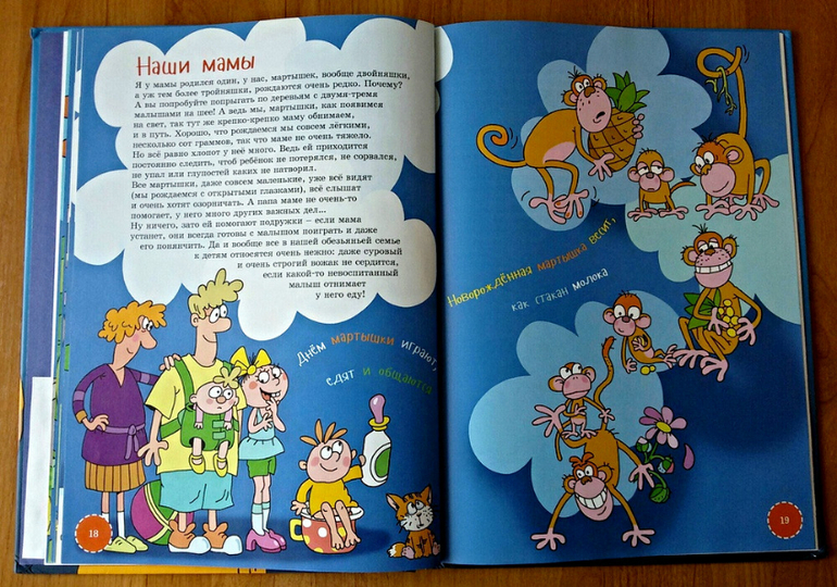 Вам ваши дети тоже напоминают мартышек? Лично мои мне очень, поэтому данную книгу брала не задумываясь, уж слишком забавные мартышки в ней нарисованы. Вся информация о зверьках дана в понятной и доступной ребенку форме. Автор рассказывает о том, где мартышки живут, почему у них разноцветная шерсть, как они используют хвост, чем питаются и как спят. Ребенок узнает, что мартышки хорошо различают цвета и умеют плавать по-лягушачьи - брассом.